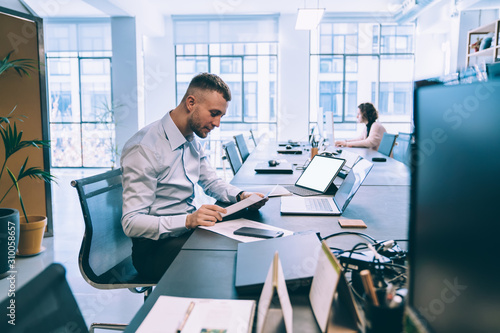 Delighted male surfing laptop and tablet in open space while analyzing statistics