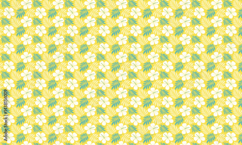 Delightful repeating pattern of tropical flowers and leaves on a yellow background.