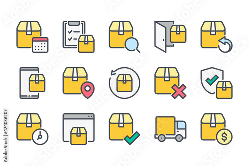 Delivery service and shipping color line icon set. Package transportation and logistics linear icons. Delivery box and express shipment colorful outline vector sign collection.