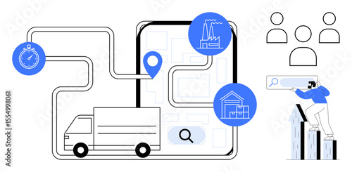 Delivery truck on map with route, location pin, stopwatch, and facility icons man analyzing graph. Ideal for logistics, delivery service, supply chain, business strategy, success time tracking