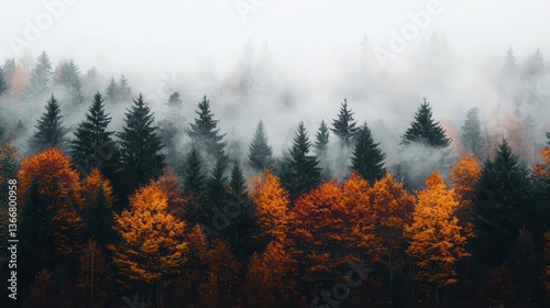 Dense autumn forest with fog rolling in, vibrant leaves contrasting with the soft white mist, atmospheric landscape