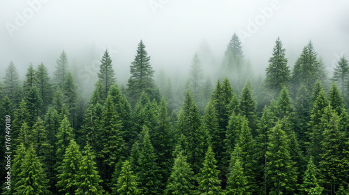 Dense evergreen trees shrouded in mist create serene and tranquil atmosphere