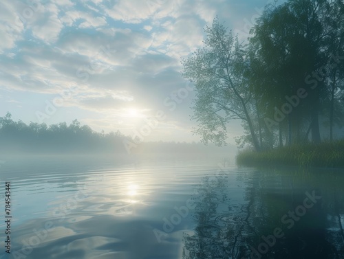 dense fog rolling over tranquil lake at dawn, serene nature landscape sunrise image