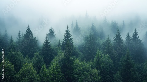 Dense forest trees covered by thick atmospheric layers of morning fog