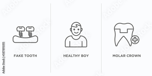dentist outline icons set. thin line icons such as fake tooth, healthy boy, molar crown vector. linear icon sheet can be used web and mobile