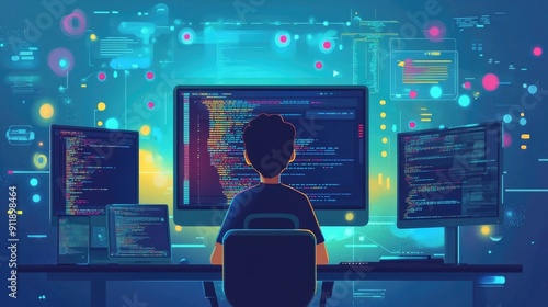 depicting software development DevOps practices and technology in a flat minimalist design style The image showcases a futuristic digital landscape with various elements related to programming