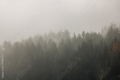Der bayerische Wald im Nebel.