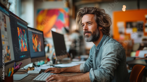 Designer focused on work at a computer, creating and developing digital designs in a modern workspace