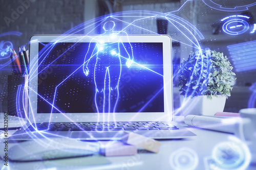Desktop computer background and education theme drawing. Double exposure. Study concept.