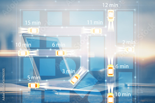 Desktop computer background in office with automobile hologram drawing. Multi exposure. Tech concept.