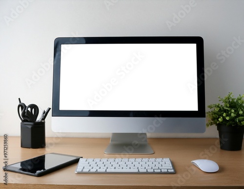 Desktop computer setup, including accessories like keyboard and mouse, representing office work, productivity, and tech.