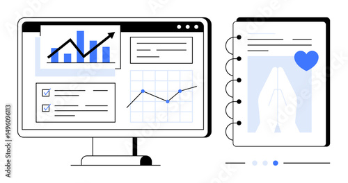 Desktop monitor displaying graphs, trends, checked tasks, and text paired with a notebook featuring a heart and praying hands. Ideal for project planning, data tracking, productivity, analytics