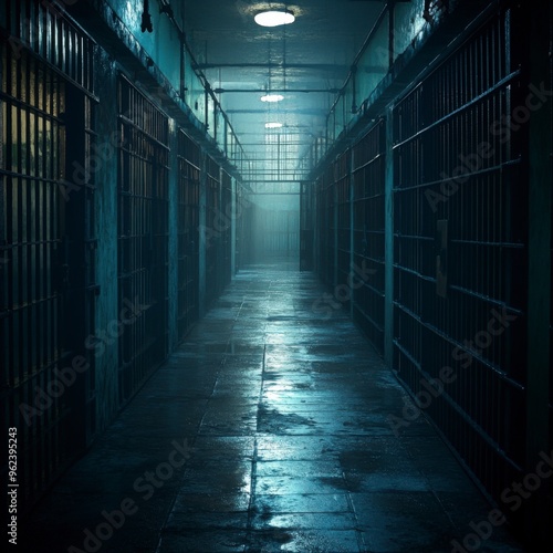 Desolate Prison Corridor with Metal Bars and Dim Lighting