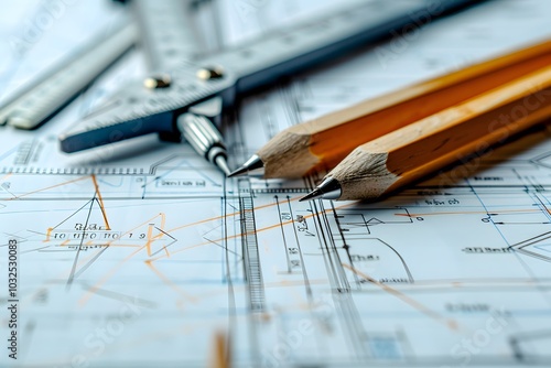 Detailed Architectural Plans with Drafting Tools and Pencils