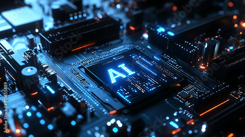 Detailed Close-Up of Modern High-Tech Motherboard with Circuitry and Components Featuring Glowing "AI" Text