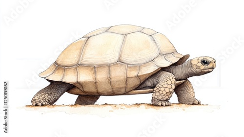 Detailed illustration of a tortoise walking on a sandy surface with a plain background