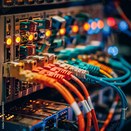 Detailed photo of an intricate setup with fiber optic and Ethernet cables alongside connectors on a pad panel, for tech ads
