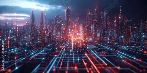 Detailed view of a futuristic cityscape with towering structures, energy-efficient buildings, and a glowing, futuristic horizon.