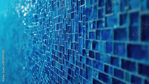Detailed view of blue mosaic tile surface functioning as a background for graphic elements, highlighting texture and pattern