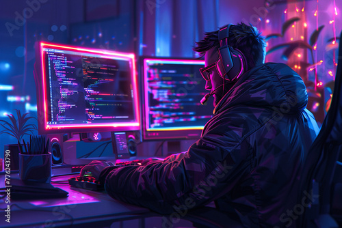 Developer at a workstation with screens emitting colorful code, visualizing programming skills