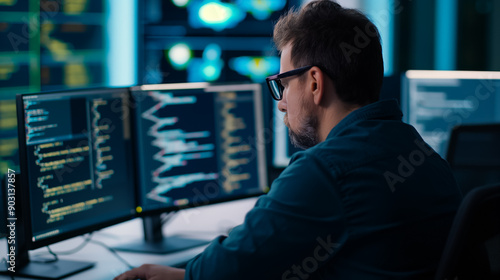 Developer coding AI algorithms for video generation, multiple monitors, complex code on screens, modern office