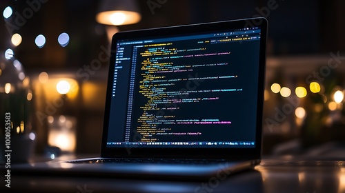 Developer coding late at night with colorful lines of code on a laptop screen. Perfect for programming, software development, and tech-related content.