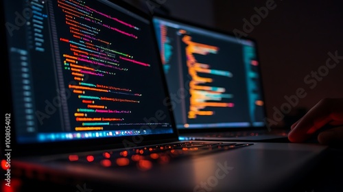 Developer coding late at night with colorful lines of code on a laptop screen. Perfect for programming, software development, and tech-related content.