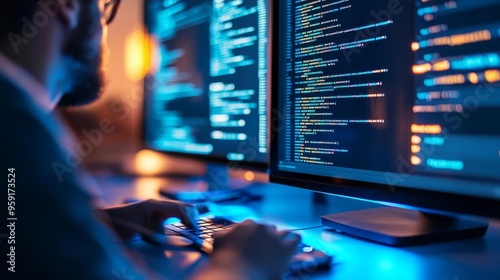 Developer debugging frontend code, digital interface, modern tech setup, blue glow