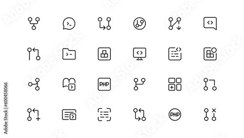 Developer icon set. Included the icons as code, programmer coding, mobile app, api, node connect, flow, logic, web coder, bug fix