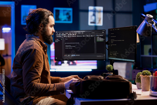 Developer in neon lit apartment implement security measures, protecting company systems and data. System administrator working from home, testing and debugging Javascript code