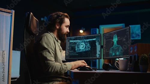 Developer inserting disk into PC containing conscient AI waving hand, saluting creator. IT admin placing cartridge in computer, awakening self aware artificial intelligence, camera B panning shot