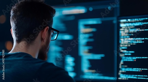 Developer optimizing code, virtual data projections, advanced technology setting