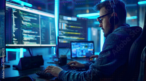 Developer working on programming and website design cyberspace concept ensuring social world safety blue tech background with intricate digital elements