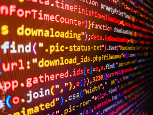 Developing HTML and technology. Programming Javascript on laptop computer screen Soft listing view. Abstract software process. React HTML, native concept on LCD. (MORE SIMILAR IN MY GALLERY)