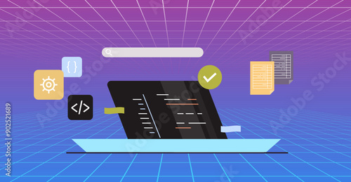 Developing new software on laptop and freelance developer programming, coding, development process concept flat vector illustration.