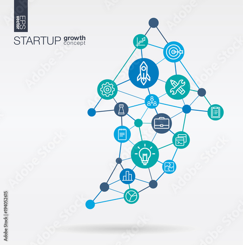Development integrated thin line web icons. Growth, success in arrow up shape. Digital neural network concept. Connected polygons system. Rocket launch startup vector background for programm app code