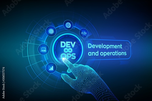 Devops. Agile development and optimisation concept on virtual screen. Software engineering. Software development practices methodology. Robotic hand touching digital interface. Vector illustration.