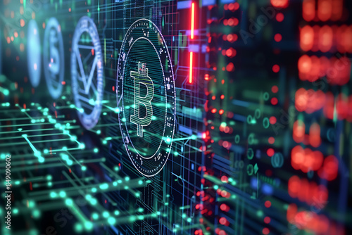 different cryptocurrency coins against a tech binary abstract background, combining digital currency symbols with streams of binary code, showcasing the intersection of technology and finance