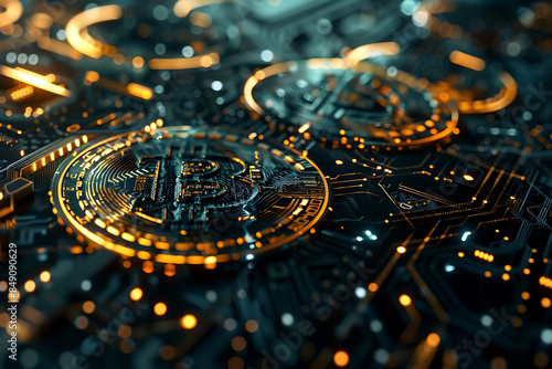 different cryptocurrency coins against a tech binary abstract background, combining digital currency symbols with streams of binary code, showcasing the intersection of technology and finance