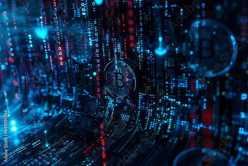 different cryptocurrency coins against a tech binary abstract background, combining digital currency symbols with streams of binary code, showcasing the intersection of technology and finance
