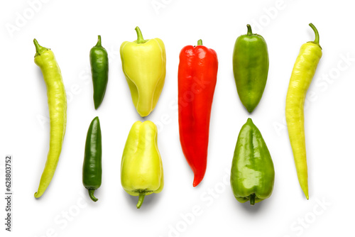 Different fresh peppers on white background