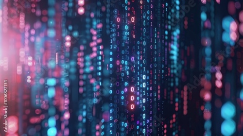 Digital abstract art of floating binary code and holographic data points, symbolizing digital storage and cloud processes, with neon highlights and a dark background