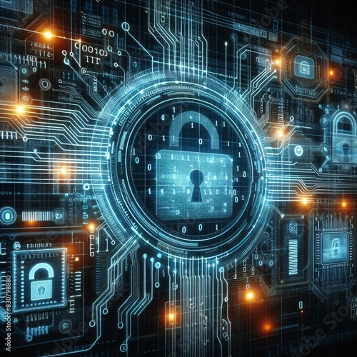 Digital artwork of a cyber security concept with a glowing digital lock amidst circuit patterns and data streams.. AI Generation