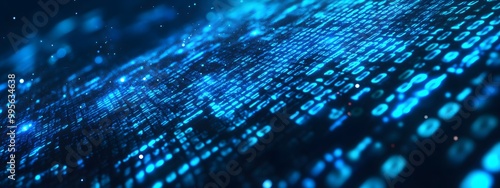 Digital background featuring blue glowing binary code, representing data technology and cybersecurity in a black space