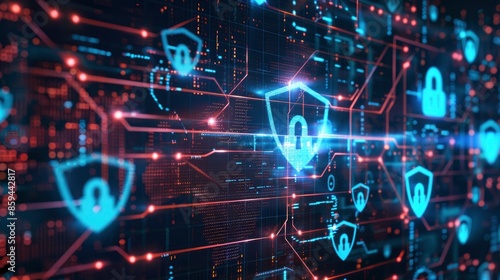 Digital background with abstract cybersecurity elements like shields and locks