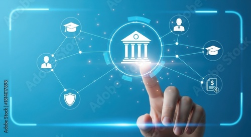 Digital banking and education services interface, user interacting with secure online finance.