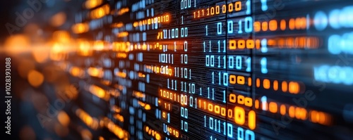 Digital binary code flowing in blue and orange, technology background with circuit-like pattern.