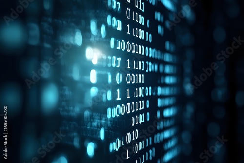 Digital binary code matrix in blue glowing numbers on dark background with selective focus and bokeh effect for technology and data concepts.