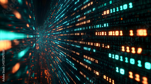 Digital Binary Code Stream in Teal and Orange Background with Depth of Field Abstract Visualization of Data Transmission