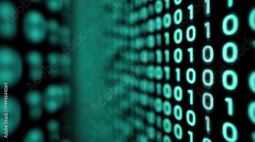 Digital binary code with a glowing teal effect.